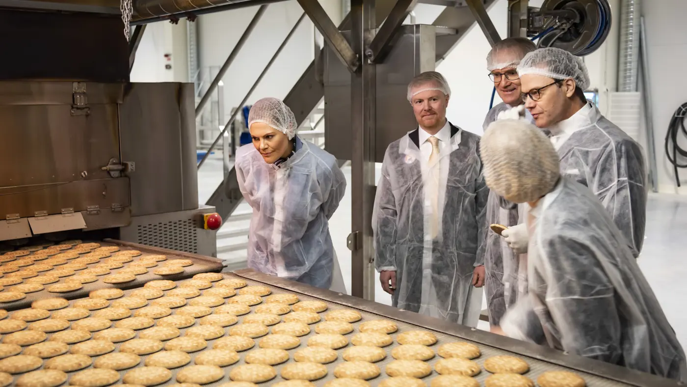 Kronprinsessan vid invigningen av nya fabriken i maj 2022. Raka produktionslinjer och investeringar i vindkraft är några av Polarbröds pusselbitar för att bygga ett hållbart företag. Foto: Polarbröd
