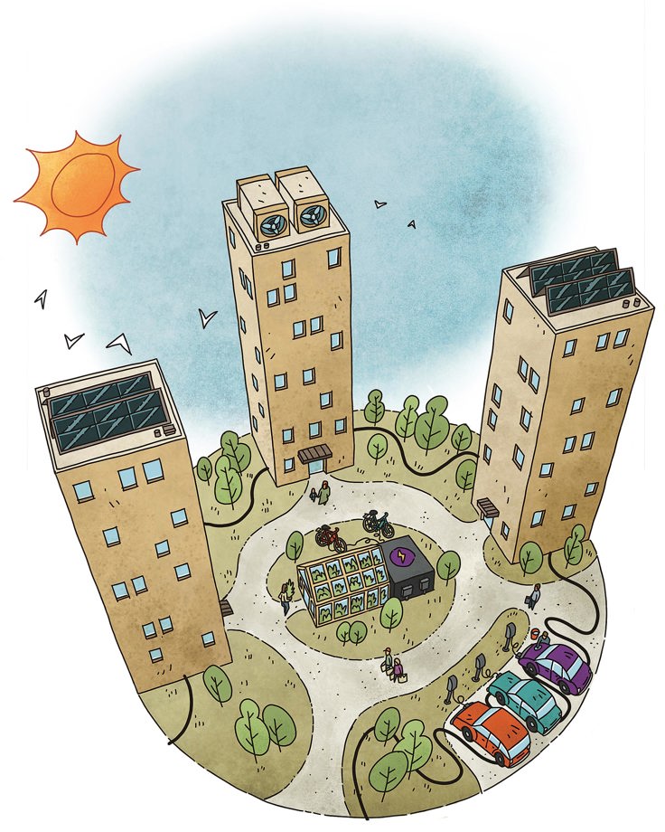 Den smarta staden består av mindre sammankopplade enheter, som en bostadsrättsförening, som producerar energi genom exempelvis sol och vind, med smart lagring och styrning. Överskottsenergi delas i sin tur med resten av staden.