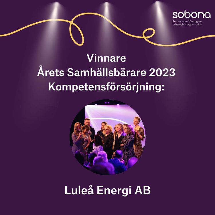 Luleå Energi utsågs under Sobonadagarna som vinnare av Årets Samhällsbärare 2023 i kategorin Kompetensförsörjning. Sobona är de kommunala företagens arbetsgivarorganisation och med 1 100 medlemsföretag representerar de 11 branscher som varje dag skapar samhällsnytta. Kompetensförsörjning är en av nutidens största utmaningar oavsett bransch, vilket gör att vi är extra stolta över den här utmärkelsen.